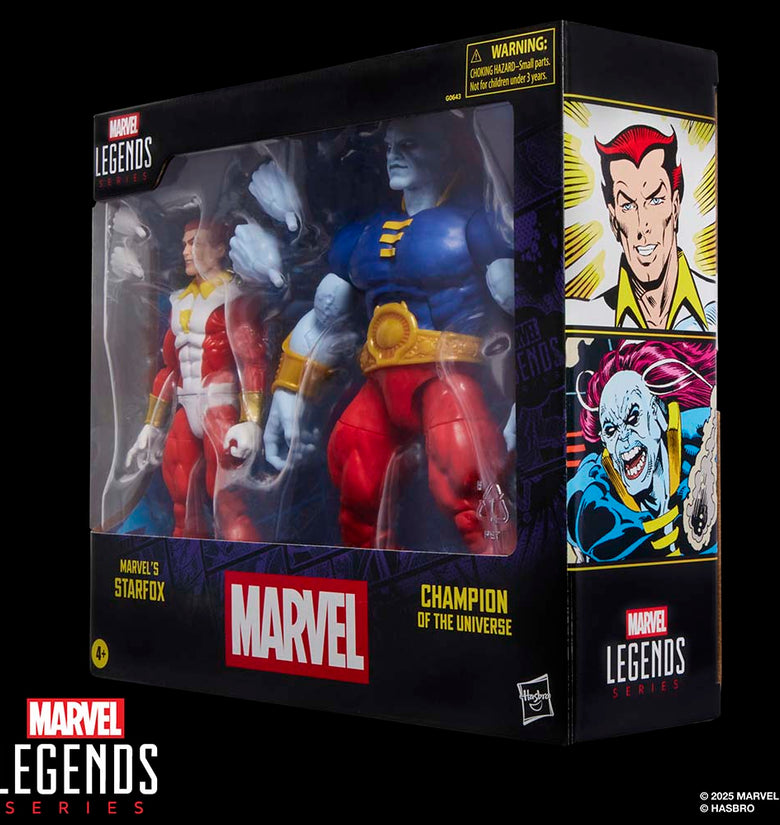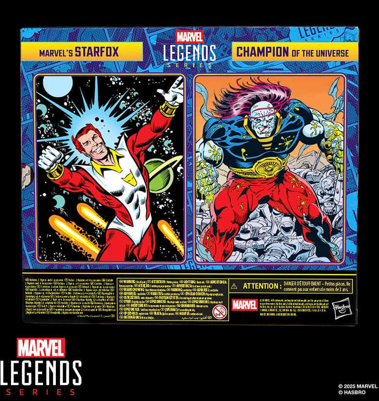 ¡Trae la emoción y la maravilla del Universo Marvel a tu colección con el pack doble de figuras de Marvel’s Starfox & Champion of the Universe de la línea Marvel Legends de Hasbro! Estas figuras coleccionables de Marvel tienen una escala de 15 cm y están diseñadas para parecerse a los personajes de los cómics de Marvel.  Estas figuras de Marvel’s Starfox and Champion of the Universe son fácilmente articulables y cuentan con diseño premium y cabezas, brazos y piernas articulables.  Este set de figuras de acción de Marvel viene con 4 accesorios: 2 manos alternativas para Marvel’s Starfox, y 2 manos alternativas para Champion of the Universe. Las figuras de acción Marvel de Hasbro a escala de 15 cm son ideales para exhibirlas en las colecciones de los fans. Reimagina escenas inspiradas en los cómics en tus estantes con las figuras de acción Marvel Legends y los artículos de colección de Marvel.