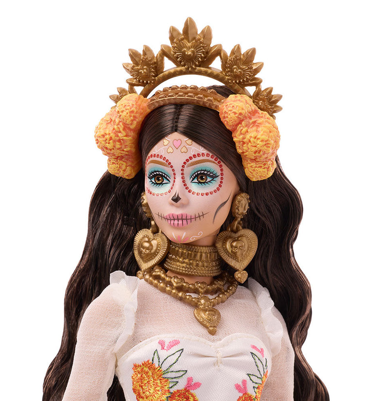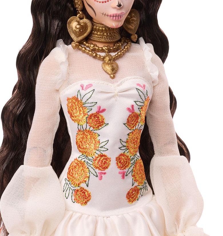 Esta muñeca de colección captura la esencia de una de las tradiciones más significativas de la cultura mexicana. Su vestido blanco, adornado con flores de cempasúchil bordadas y faldas de varios niveles con detalles en tonos vibrantes, refleja el arte y la riqueza simbólica de la celebración.
